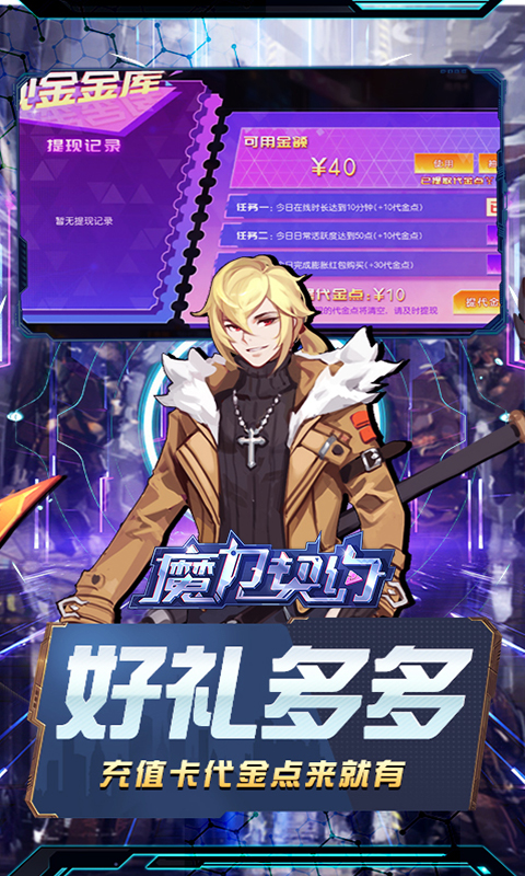 都市异能幻想MMO《魔力契约》0.05折狂欢今日引爆,全档位充值永享0.05折优惠!登录即送VIP20,炫酷时装,还能畅享多重福利系统,真充卡,直充币,代金券领到手软!买断特权点击就送,每日领取神尊礼包,再享专属特权寻宝!霓虹闪烁的机械文明之下,魔物撕裂时空侵袭现世,暗影中的阴谋悄然浮动……身为搜查员的你,在执行任务时竟发现了另一个濒临崩溃的平行世界。你与异界精灵缔结“魔力契约”,自此踏上一场拯救之旅。沉浸漫游未来都市,酷炫技能特效炸裂全场!四大职业自由选择,立即下载,打出你的专属战斗风格!