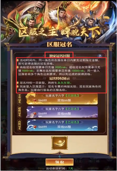 3)该登入区服的冠名权过期后一周后,如需重新冠名则需按照日充要求增加实现